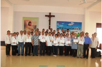 Nghi thức bế mạc khóa Tập huấn diễn ra lúc 9g45 ngày 12/04/2013 tại Trung Tâm Mục Vụ Đà Nẵng. Tham dự buổi bế mạc có sự hiện diện của Đức Cha Giuse Châu Ngọc Tri – Giám mục Giáo phận Đà Nẵng, Cha Tổng đại diện giáo phận.Soeur Thùy Dương đánh giá chung khóa học và có đôi lời cám ơn Đức Cha, Cha Tổng đại diện, Cha Giám đốc Caritas Đà Nẵng, quý Cha Giám đốc Trung Tâm Mục Vụ, quý anh chị em phục vụ ẩm thực trong những ngày tập huấn.Đại diện cho ban Tổ Chức, Soeur Thủy – trong Nhóm Liên Kết tổng kết khóa học và tóm lược toàn bộ chương trình, nội dung và các hoạt động của khóa học. Cha Hồ Thái Sơn đại diện tham dự viên cám ơn Thầy Giảng Viên. Tiếp đến, Cha Võ Tá Chân cám ơn Cha Giám đốc Caritas Đà Nẵng và Nhóm Liên Kết.Sau 3 ngày học với nhiều hoạt động và bài tập thực hành khá vất vả của khóa Viết dự án và lập kế hoạch, các tham dự viên vui mừng nhận Giấy chứng nhận từ tay Đức Cha Giuse và Thầy Giảng viên trao cho từng người như là thành quả cho những sự cố gắng học tập của mình. Nghi thức bế mạc khóa Tập Huấn kết thúc trong tiếng vỗ tay nồng nhiệt.Buổi bế mạc long trọng hơn khi Đức Cha Giuse cùng với quý Cha dâng Thánh Lễ Tạ ơn Chúa cho kết quả tốt đẹp của khóa học và cho những dự tính trong tương lai của quý Cha, Quý Soeurs, Quý Anh Chị Em phục vụ trong công tác Bác ái Xã hội.Bài giảng của Đức Cha Giuse hết sức thiết thực và bài Tin Mừng hôm nay thật trùng khớp với những gì quý Tham Dự Viên được học trong mấy ngày qua về cách Viết Dự Án:Chúa Giêsu làm phép lạ hóa bánh ra nhiều như một dự án:- Chúa Giêsu thấy nhu cầu của con người (xác định mục tiêu): Thấy đám đông dân chúng đói- Thực hiện dự án: bảo mọi người ngồi xuống, các môn đệ phân phát cho dân chúng ăn;- Khả năng mình có: một em bé có năm chiếc bánh lúa mạch và hai con cá;- Lượng giá dự án kết thúc: 5.000 người ăn no, còn dư 12 thúng đầy bánh vụn.Ngài nói tiếp: “Chúa Giêsu là bậc Thầy của tất cả mọi dự án, dự án của chúng ta thật nhỏ bé quá so với dự án của Thiên Chúa, Thiên Chúa Tình Yêu, Đấng đã tạo dựng nên muôn loài muôn vật, quan phòng cho tất cả mọi sự sống của sinh linh, dự án không phải chỉ để nuôi sống con người với những nhu cầu hằng ngày về thể lý, mà còn là dự án về đàng thiêng liêng, chương trình cứu độ nhiệm màu của Thiên Chúa dành cho mọi người, con người của chúng ta – những tác phẩm yêu quý của Ngài, thật tuyệt vời. Chính cuộc đời của Chúa Giêsu đã dạy chúng ta điều đó. Các dự án và hoạt động của chúng ta không thể không tham chiếu vào tính chuyên môn và việc học dĩ nhiên rồi nhưng mà bên cạnh đó chúng ta cần phải tham chiếu vào chính Thiên Chúa Tình Yêu. Những công việc chúng ta làn hôm nay là làm thay cho Chúa, thay mặt Chúa. Vì thế, chúng ta không thể tách chương trình của chúng ta ra khỏi chương trình của Thiên Chúa, thực thi ý muốn của Thiên Chúa là chúng ta đang thực hiện chương trình yêu thương của Ngài. Và công tác Bác ái của chúng ta phải làm sao để truyền tải được thông điệp tình yêu Thiên Chúa cho mọi người.”Sau Thánh lễ, tất cả các tham dự viên cùng dùng bữa cơm trưa chung với Đức Cha, Cha Tổng đại diện, Quý Cha Giám đốc Trung Tâm Mục Vụ và sau đó chia tay trở về Giáo phận của mình để tiếp tục công việc bác ái phục vụ.