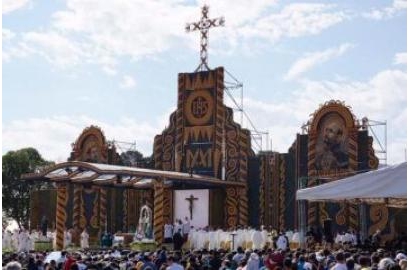 Có khi nào mà sự lộng lẫy lại đi đôi với sự đơn giản bao giờ không? Xin cứ xem qua vài hình ảnh cuả lễ đài thì sẽ thấy ngay. Cấu trúc cuả lễ đài là một cái tháp, dài 131 feet (40m) và cao 56 feet (17m ), có một diện tích là 4305 feet vuông (400m2). Tất cả được bao phủ bởi những trái ngô, dừa và bí. Ở trung tâm cao nhất là một cây thánh giá. Bên trái có hình Thánh Phanxicô, tên hiệu của Đức Giáo Hoàng, và bên phải là Thánh Inhaxiô Loyola, đấng sáng lập Dòng Tên là dòng đã gieo rắc hạt giống đức tin sang Paraguay.