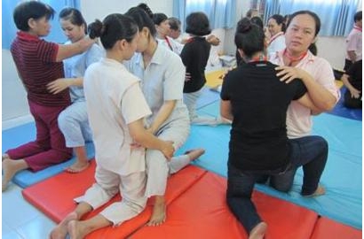 Trong quá trình nghe cô Nguyễn Ánh Chí hướng dẫn lý thuyết cũng như thực hành, các tham dự viên đã nỗ lực học tập một cách nghiêm túc, đặc biệt trong phần thực hành theo nhóm. Hai người là một nhóm nhỏ và thực hành cho nhau luân phiên đổi vai nhằm tạo điều kiện tốt nhất để tất cả tham dự viên đều nắm bắt và thực hành các động tác mà giảng viên vừa hướng dẫn.Ngày học đầu tiên kết thúc vào lúc 16 giờ 30 phút trong sự nỗ lực không ngơi nghỉ của “cô giáo” và cả “học trò”. Khóa tập huấn thực hiện trong 5 ngày thứ Bảy từ 31/5 đến 28/6/2014.Được biết, đây là dự án ban đầu mà ban hỗ trợ người khuyết tật Caritas Sài Gòn mong ước thiết lập và vận hành một trung tâm phục hồi chức năng toàn diện cho trẻ bại não tại cộng đồng trên cả ba phương diện: điều trị, vui chơi và học tập, hòa nhập vào cộng đồng.
