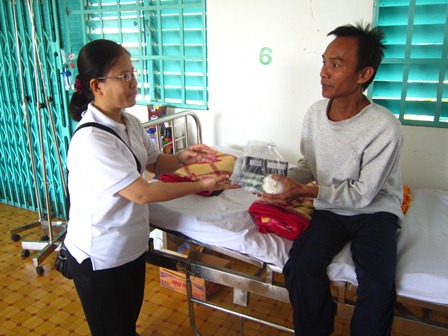 Dưới sự hướng dẫn của Nữ tu phụ trách cộng đoàn, chúng tôi nhanh chóng đi đến từng gường bệnh, ân cần thăm hỏi và trao tận tay từng người những phần quà bé nhỏ. Đây là tấm lòng của Caritas luôn hướng về người bệnh ngay cả những lúc họ cảm thấy tuyệt vọng và cô đơn nhất. Chúng tôi đến với họ bằng một niềm tin sâu sắc: “không có gì đích thực nhân loại mà không có âm vang trong cõi lòng người môn đệ Đức Kitô” (Gaudium et Spes, 1).