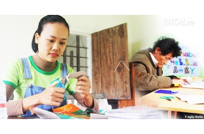 Công việc đòi hỏi sự tỉ mẩn, đòi hỏi thời gian để thành thục (Ảnh dẫn theo: giaoducthoidai)Cô kể, hai người thợ trong xưởng của cô đều là người làng. Nhưng vì bệnh tật nên họ không có việc làm, trước đây chỉ biết lang thang đầu làng cuối xóm. Từ khi được cô mời về làm, ngày hai bữa, hai người chăm chỉ tới nhà Khởi để cắt cắt dán dán. Bước đầu, cô chỉ mới trả được cho mỗi người 1 triệu đồng một tháng. Số tiền tuy nhỏ nhưng cũng là một khoản, giúp cho hai người tật nguyền ấy đóng góp cho gia đình.