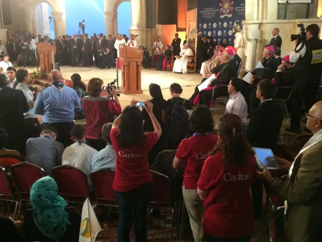 On the first leg of his trip in Jordan, the pope told dignitaries at the Royal Palace about the work of the national Caritas and how it was helping Syrian refugees driven from their homes.