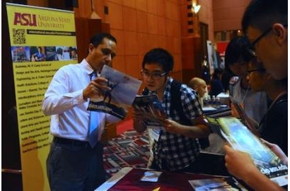 Học sinh trung học ở Việt Nam đang xem các tờ thông tin quảng bá về trường Đại học Arizona tại hội chợ triển lãm giáo dục quốc tế ở Hà Nội (Ảnh: AFP/Hoàng Đình Nam)
