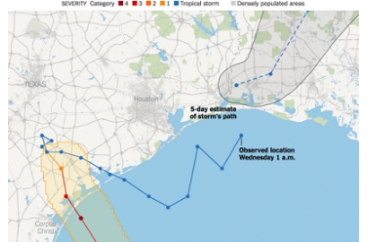 Đường đi của bão Harvey đến 1 giờ sáng 30/8. Đồ hoạ: NewYorkTimes. |