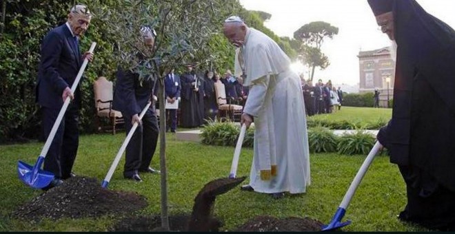 Và nơi đó, trong góc Vườn Vatican, có bốn người: một người Do Thái, hai người Kitô hữu và một người Hồi giáo, đã cùng nhau trồng một cây ô liu như một biểu tượng bền vững của mong muốn hoà bình giữa hai dân tộc Israel và Palestine.
