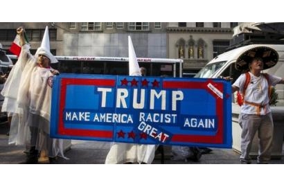 Hai người biểu tình giương biểu ngữ "Make America racist again" (Khiến nước Mỹ phân biệt chủng tộc một lần nữa), nhại lại câu khẩu hiệu tranh cử "Make America great again" (Khiến nước Mỹ vĩ đại một lần nữa) của ông Trump.