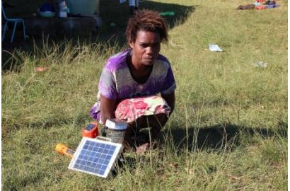 | Elisan charges her phone and lamps ready for another night in the No. 2 Lagoon Evacuation Centre near Port Vila in Vanuatu following Cyclone Pam. Credit: Mark Mitchell/ Caritas Aotearoa New Zealand |