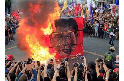 Người biểu tình đốt hình nộm có mặt của Tổng thống Rodrigo Duterte bên ngoài Dinh tổng thống tại Manila ngày 21-9 vừa qua - Ảnh: REUTERS