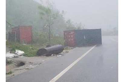 Thùng container và bồn chứa bị thổi bay ra đường.