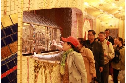 Chúng tôi chụp hình chung trước tượng cha Piô nơi đàng thánh giá, sau đó vào nhà thờ viếng Chúa và tham quan. Có nhiều bức tranh theo nghệ thuật mosaic hai bên Nhà thờ. Bức tranh trên cung thánh tuyệt đẹp, Đức Mẹ bồng Chúa Hài Nhi ban ơn cho nhân loại.