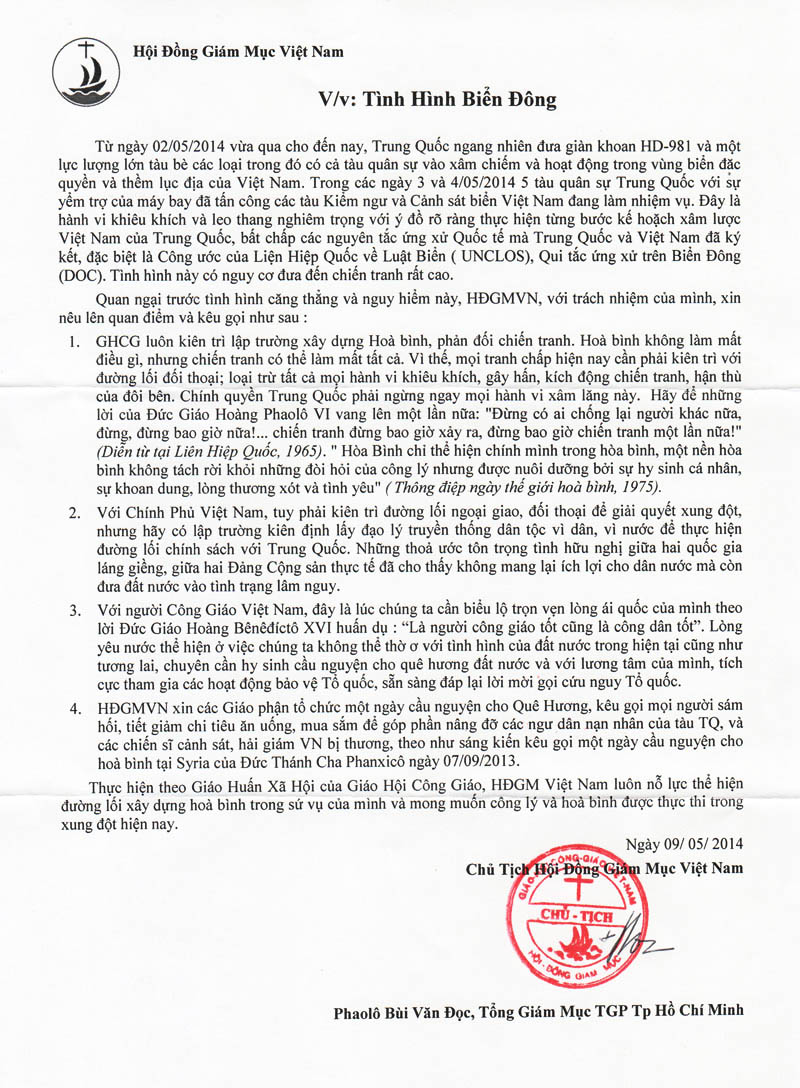 Thư kêu gọi của Chủ tịch Hội đồng Giám Mục Việt Nam về tình hình Biển Đông