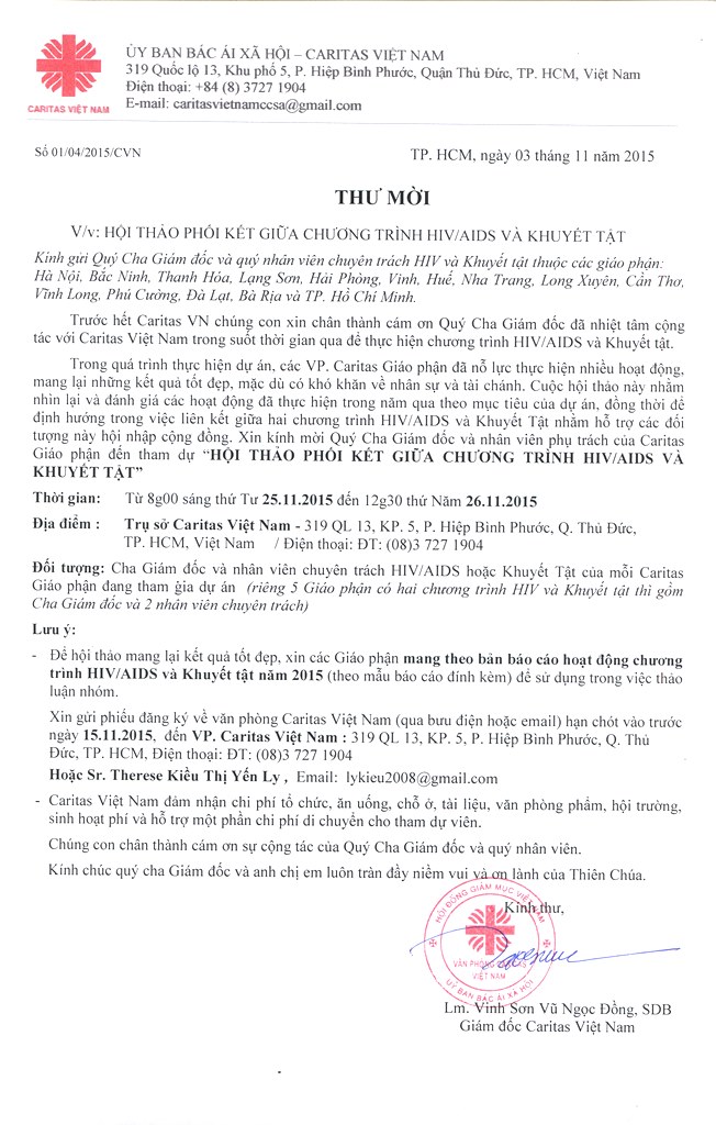 Thư mời Hội thảo phối kết giữa chương trình trình HIV/AIDs và Khuyết tật