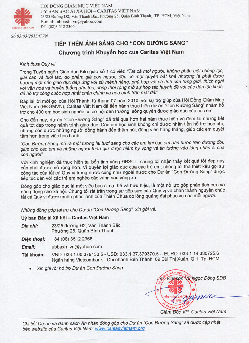 1. Thư ngỏ giới thiệu chương trình Con Đường Sáng - bản tiếng Việt (có chữ ký và đóng dấu)