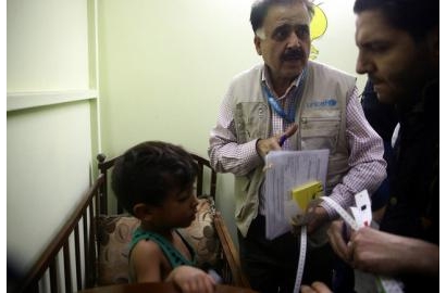 Một nhân viên y tế của UNICEF đang thăm khám sức khỏe cho một em bé ở Kafra Batna tại vùng ngoại ô thủ đô Damascus, Syria - Ảnh: REUTERS