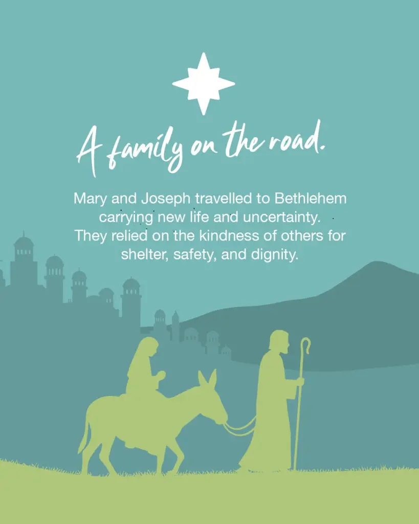 Đức Maria và thánh Giuse, mang trong mình một sự sống mới, buộc phải đến Bêlem dù cuộc hành trình có thể nguy hiểm cho thai kỳ của Đức Maria. Các ngài lên đường trong sự bất an, tìm kiếm sự an toàn, nơi trú ngụ và phẩm giá - dựa vào lòng tốt của người khác.