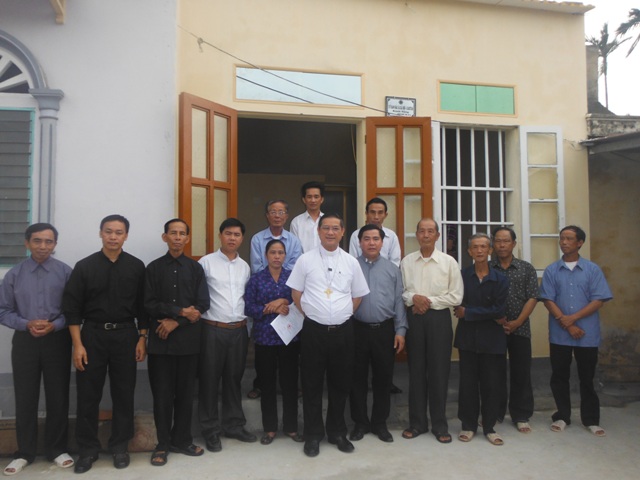 Đức Cha Tôma và phái đoàn Caritas trước ngôi nhà mới của bà Trần Thị Nhị