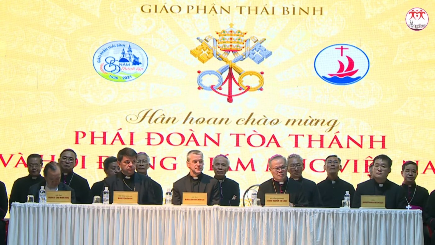 Lúc 18g20, tại đại sảnh Toà Giám mục, Cha Phanxicô Assisi Nguyễn Tiến Tám, Tổng Đại diện giáo phận đã thay mặt giáo phận chủ nhà chính thức chào mừng phái đoàn Toà Thánh và Hội đồng Giám mục Việt Nam (HĐGM) đến thăm Thái Bình nhân dịp giáo phận mừng Năm Thánh kỷ niệm 85 năm thành lập.