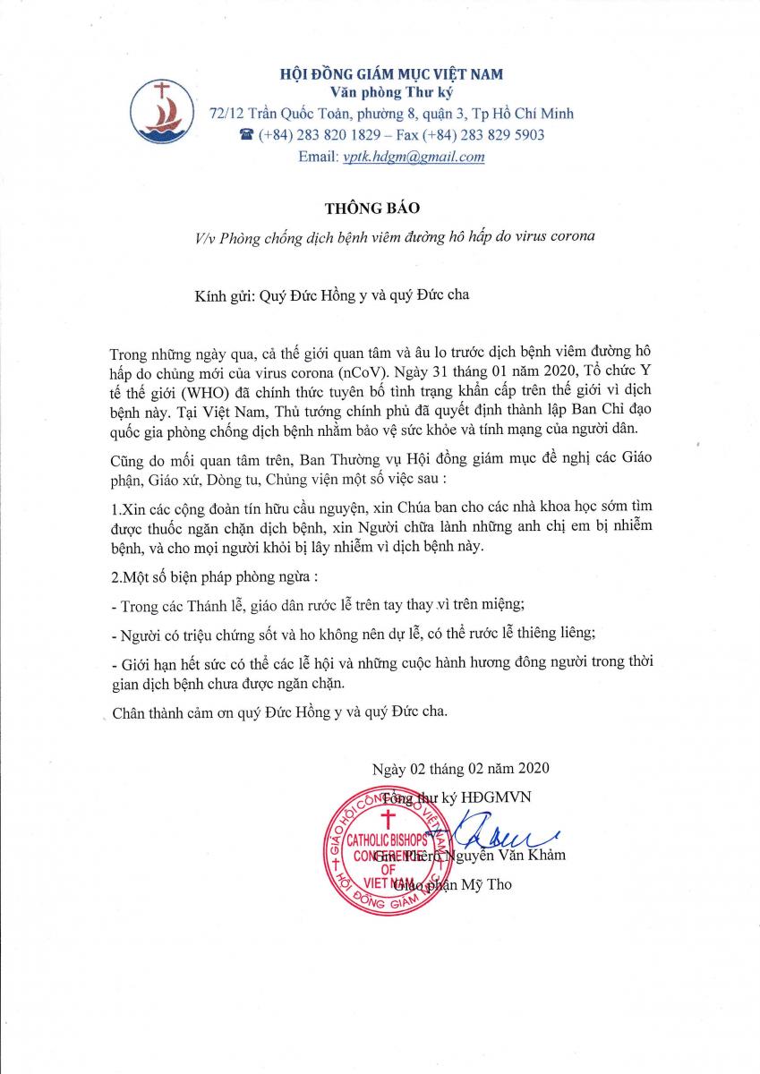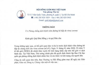 Hội Đồng Giám Mục Việt Nam: Thông báo phòng chống dịch bệnh viêm đường hô hấp do virus corona