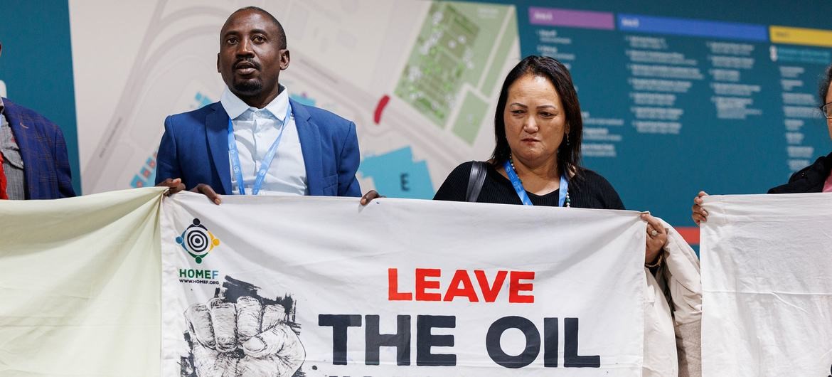 © UNFCCC/Habib Samadov - Các nhà hoạt động phản đối nhiên liệu hóa thạch tại COP29 tại Baku, Azerbaijan.