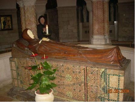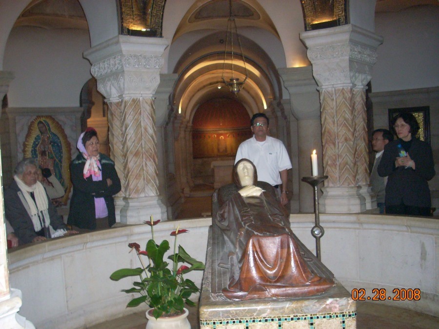 Phía trong Nhà thờ rất sáng, mái vòm chính diện trên gian cung thánh có một bức tranh Đức Mẹ bồng Hài Nhi Giêsu bằng khảm đá mạ vàng. Sàn nhà được trang trí bằng tranh khảm đá hình tròn xung quanh là các dấu hiệu cung Hoàng đạo (theo khoa chiêm tinh học ngàn xưa). Sau kinh cầu nguyện, chúng tôi đi xuống tầng hầm, đây là một nhà nguyện khá rộng rãi và trang nghiêm năm dưới hầm Vương Cung Thánh Đường, có hai lối lên xuống khác nhau với mỗi bên 24 bậc thang bằng đá cẩm thạch. Giữa ngôi nhà nguyện là bàn thờ đặt tượng Đức Mẹ khổ lớn gấp ba người thường nằm trong thế ngủ. Phía trên bàn thờ bằng đá đặt cách chân Đức Mẹ khoảng 3 mét là bức hình khổ lớn vẽ Chúa Giêsu đứng ở giữa bồng linh hồn Đức Mẹ, còn xác Đức Mẹ được quàn ở phía trên bức hình. Nếu hầu như trong tất cả các bức hình đều vẽ Đức Mẹ ẵm Chúa Hài Đồng, thì ở đây chính Chúa Giêsu lại ẵm linh hồn của Mẹ Người. Ngôi nhà nguyện được xây theo kiểu Byzantin, có rất nhiều cột, đơn sơ nhưng rất đẹp. Ở phía gian chính nhà nguyện có nhiều bàn thờ phụ hai bên. Trên một trong các bàn thờ ấy có nhà tạm đặt Mình Thánh Chúa. Thật cảm động khi được chiêm ngắm và được sờ bằng tay mình vào chính nơi Đức Maria – Mẹ Thiên Chúa đã qua đời và được rước cả hồn lẫn xác về Thiên Đàng. Sau khi Đức Mẹ qua đời ở đây, các Tông Đồ đã đưa xác Đức Mẹ đi qua cửa Sion để an táng ở một địa điểm khác. Chúng tôi thành kính quỳ gối lần hạt trước tượng Đức Mẹ ngủ. Nhìn Đức Mẹ thánh thiện ngủ giấc bình an, ai cũng cảm động nguyện cầu khấn xin. Nhiều người thổn thức bên Mẹ.