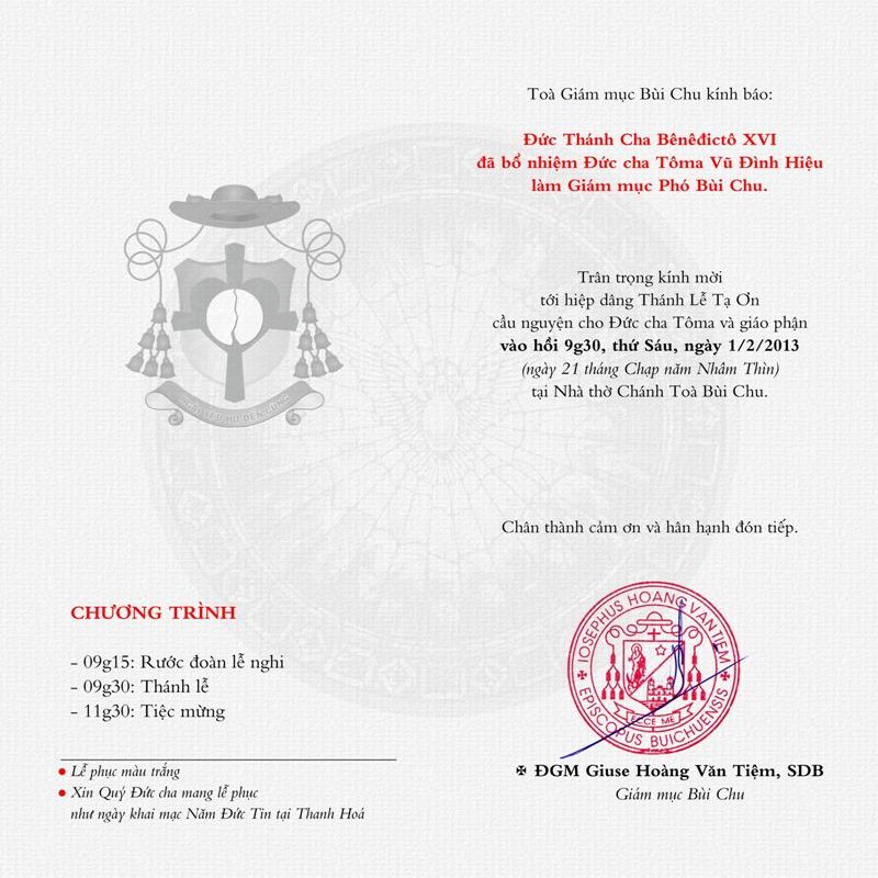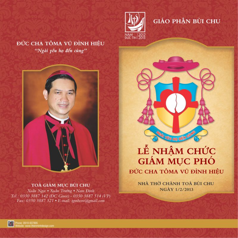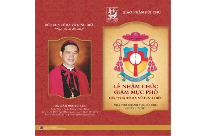 Như tin đã đưa, ngày 24 tháng Mười Hai vừa qua, Đức Thánh Cha Bênêđictô XVI đã bổ nhiệm Đức cha Tôma Vũ Đình Hiệu làm Giám mục phó giáo phận Bùi Chu. Theo tin từ Tòa giám mục Bùi Chu, lễ nhậm chức của Đức cha Tôma sẽ diễn ra tại Nhà thờ chính tòa Bùi Chu lúc 9g30 thứ Sáu, 1-2-2013.