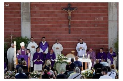 Đức cha Giáo phân Ascoli Piceno, Giovanni D’Ercole, đã chủ sự Thánh lễ. Cùng đồng tế với ngài có Đức Cha Domenico Pompili, Giám mục Giáo phận Rieti và Tổng Giám mục Petrocchi của Tổng Giáo phận Aquila. Đến tham dự Thánh lễ có Tổng thống Sergio Mattarella của Italia, Thủ tướng Matteo Renzi, các chủ tịch Thượng viện và Hạ viện Grasso và Boldrini. Hình ảnh của các trẻ em được đặt cạnh các quan tài là những hình ảnh gây xúc động nhất.