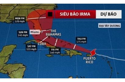 Bão Irma hiện được xếp ở cấp độ 4 với sức gió 250 km/h và các nhà dự báo cho rằng nó nhiều khả năng sẽ trở lại cấp độ 5 khi tiến gần tới bờ biển Key West vào sáng 10/9, theo AP.