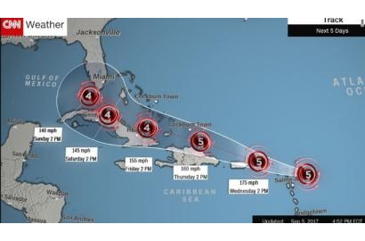 Dự báo đến rạng sáng ngày 6-9 (giờ địa phương), bão Irma sẽ áp sát hoặc quét ngang qua quần đảo Antigua và Barbuda, St. Kitts and Nevis và Anguilla. Đến trưa 6-9, Irma sẽ quét qua quần đảo Virgin và Puerto Rico.