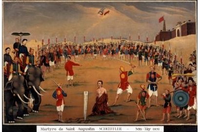 - Thánh Giám mục Xuyên, chân tay bị trói vào bốn cọc. Năm lý hình cầm 5 cái rìu, sẵn sàng nghe lệnh quan án sát. Vừa nghe lệnh, hai lý hình chặt hai chân, hai lý hình chặt hai tay, đến lượt lý hình thứ năm chặt đầu. Rồi họ mổ bụng ngài cắt lấy ruột gan.