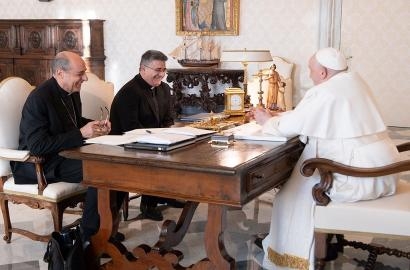 Đức Thánh Cha Phanxicô chia vui với Đức Hồng y Víctor Manuel Fernández, bên phải, Bộ trưởng Bộ Giáo lý Đức tin, và Đức ông. Armando Matteo, thư ký bộ giáo lý của Bộ, trong cuộc họp tại thư viện của Điện Tông Tòa Vatican ngày 18 tháng 12 năm 2023. (Ảnh CNS/Truyền thông Vatican)
