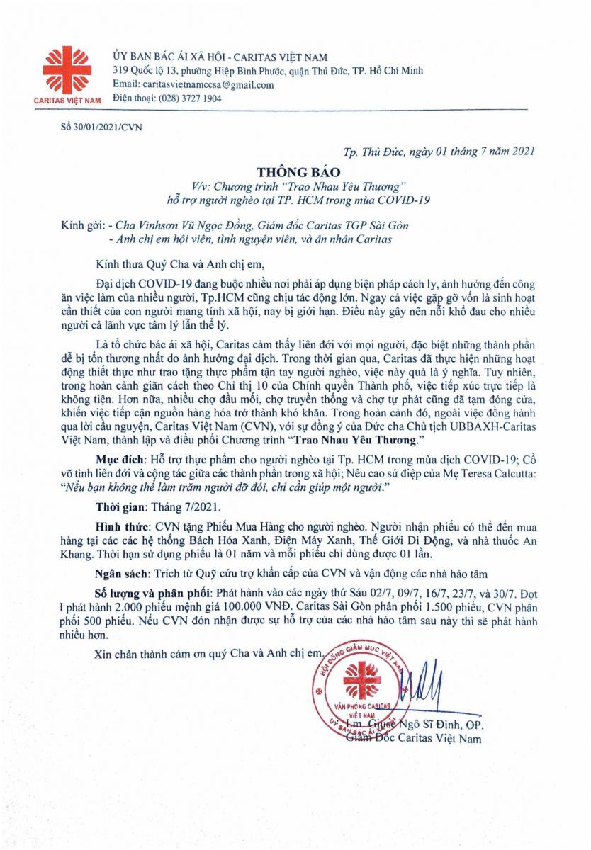 Caritas Việt Nam: Thông báo chương trình Trao Nhau Yêu Thương hỗ trợ người nghèo tại TP. HCM trong mùa COVID-19