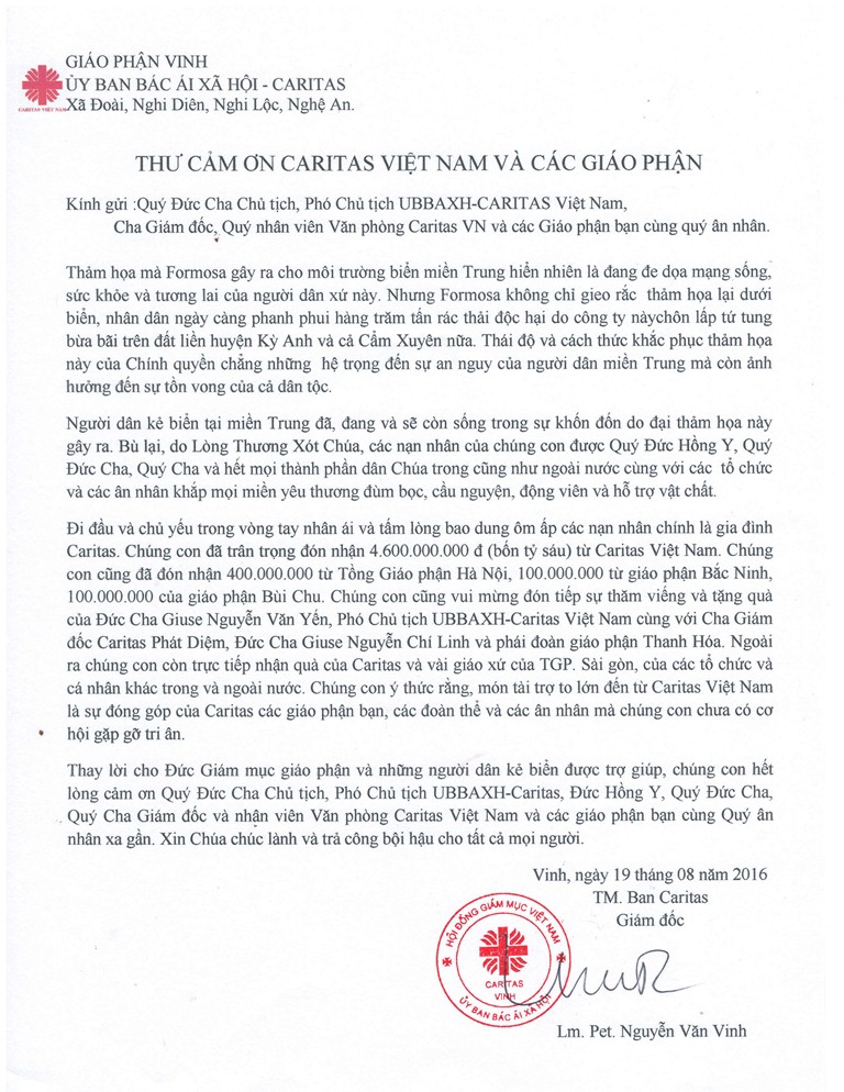 Thư cảm ơn của Caritas Vinh về việc cứu trợ thảm họa môi trường biển