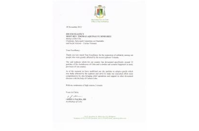 Thư cám ơn của Tổng giáo phận Cebu gởi Đức Cha Vũ Đình Hiệu Giám mục Bùi Chu Chủ tịch Ủy ban Bác ái Xã hội – Caritas Việt Nam