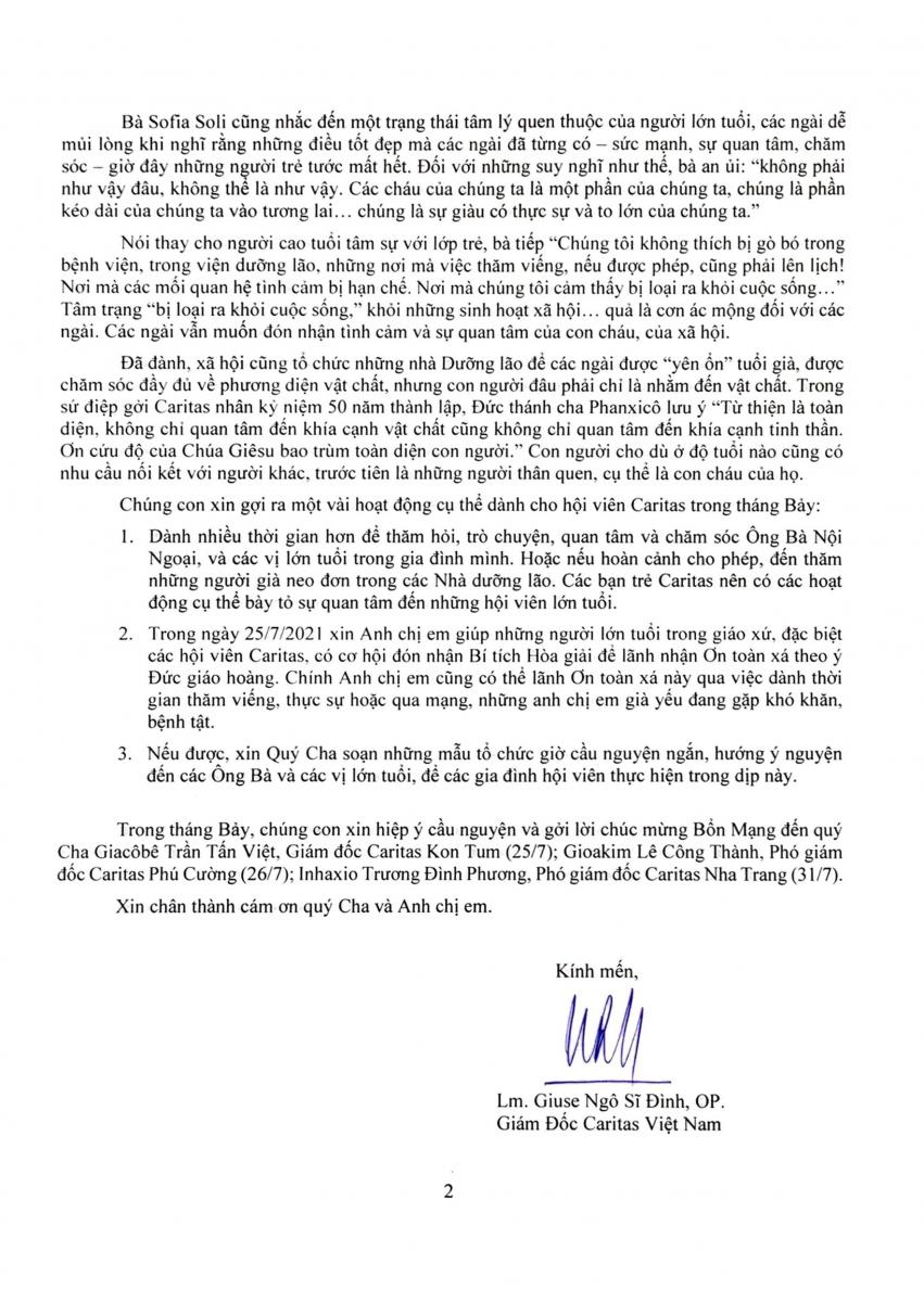 2. Trong ngày 25/7/2021 xin Anh chị em giúp những người lớn tuổi trong giáo xứ, đặc biệt các hội viên Caritas, có cơ hội đón nhận Bí tích Hòa giải để lãnh nhận Ơn toàn xá theo ý Đức giáo hoàng. Chính Anh chị em cũng có thể lãnh Ơn toàn xá này qua việc dành thời gian thăm viếng, thực sự hoặc qua mạng, những anh chị em già yếu đang gặp khó khăn, bệnh tật.