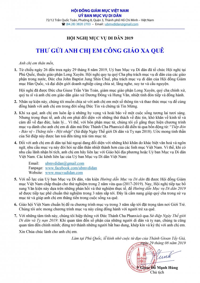 Từ chiều ngày 26 đến trưa ngày 29 tháng 8 năm 2019, Uỷ ban Mục vụ Di dân trực thuộc Hội Đồng Giám Mục Việt Nam đã tổ chức Hội nghị tại Phú Quốc, thuộc giáo phận Long Xuyên. Sau ba ngày làm việc, Hội nghị đã có thư chung để chia sẻ với anh chị em công giáo xa quê một số thông tin và thao thức mục vụ để cùng đồng hành với anh chị em trong đời sống Đức Tin và chứng tá Tin Mừng. Sau đây là nguyên văn thư chung của Hội Nghị: