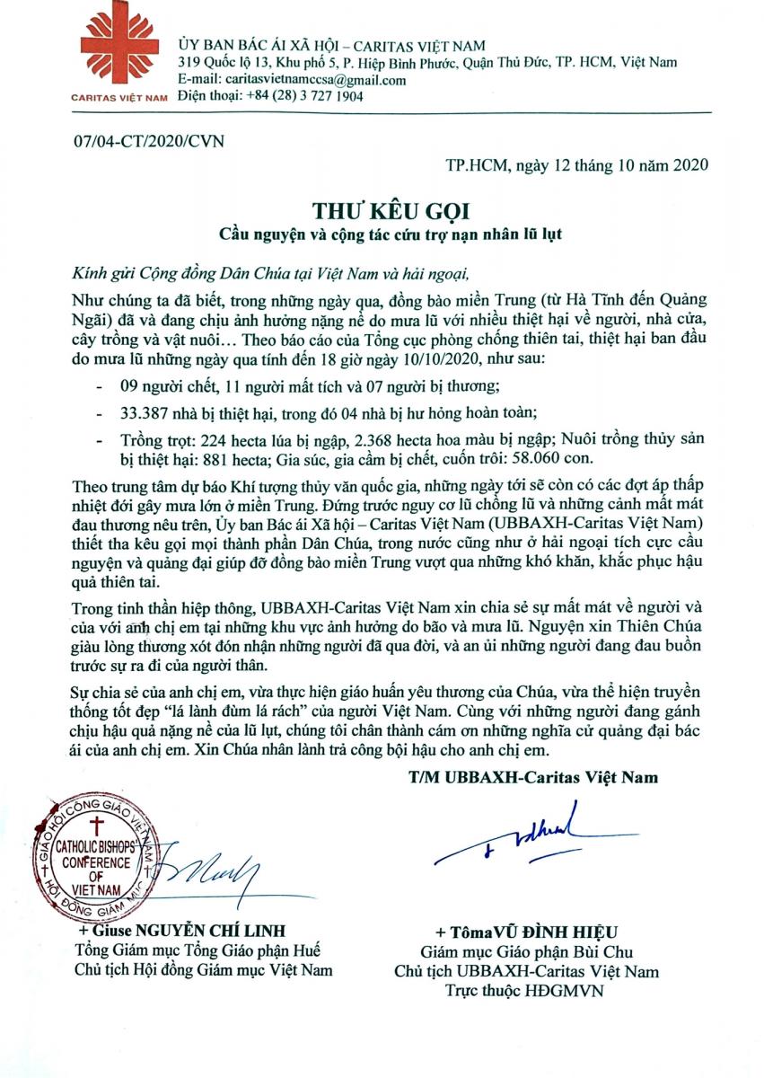Thư kêu gọi cầu nguyện và cộng tác cứu trợ nạn nhân lũ lụt