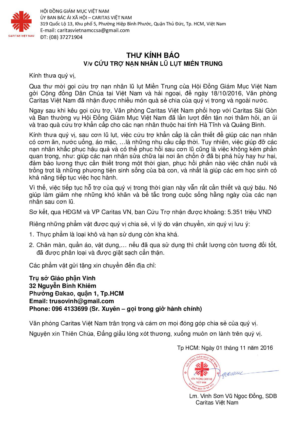 Thư Kính Báo Về Việc Cứu Trợ Nạn Nhân Lũ Lụt Miền Trung