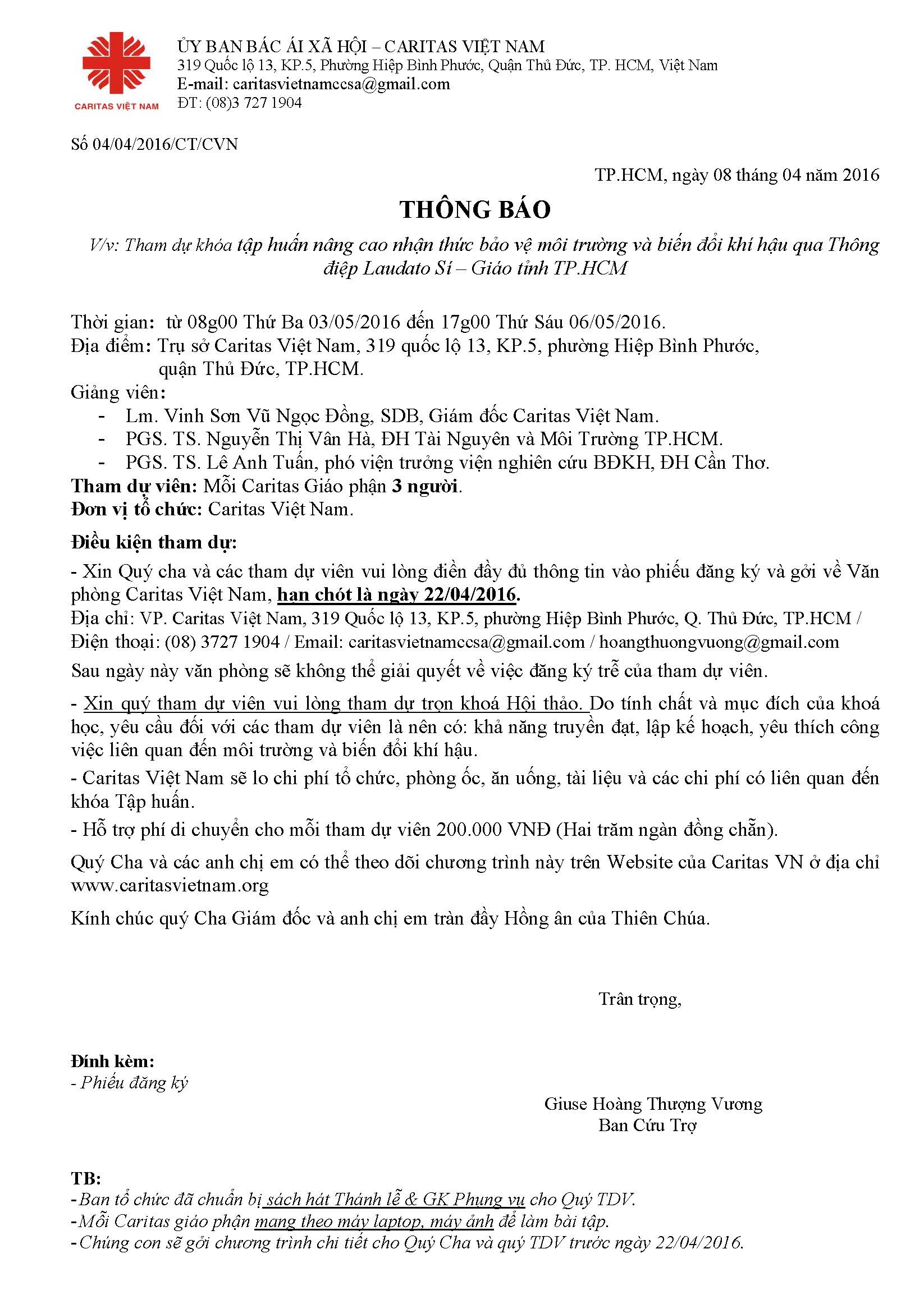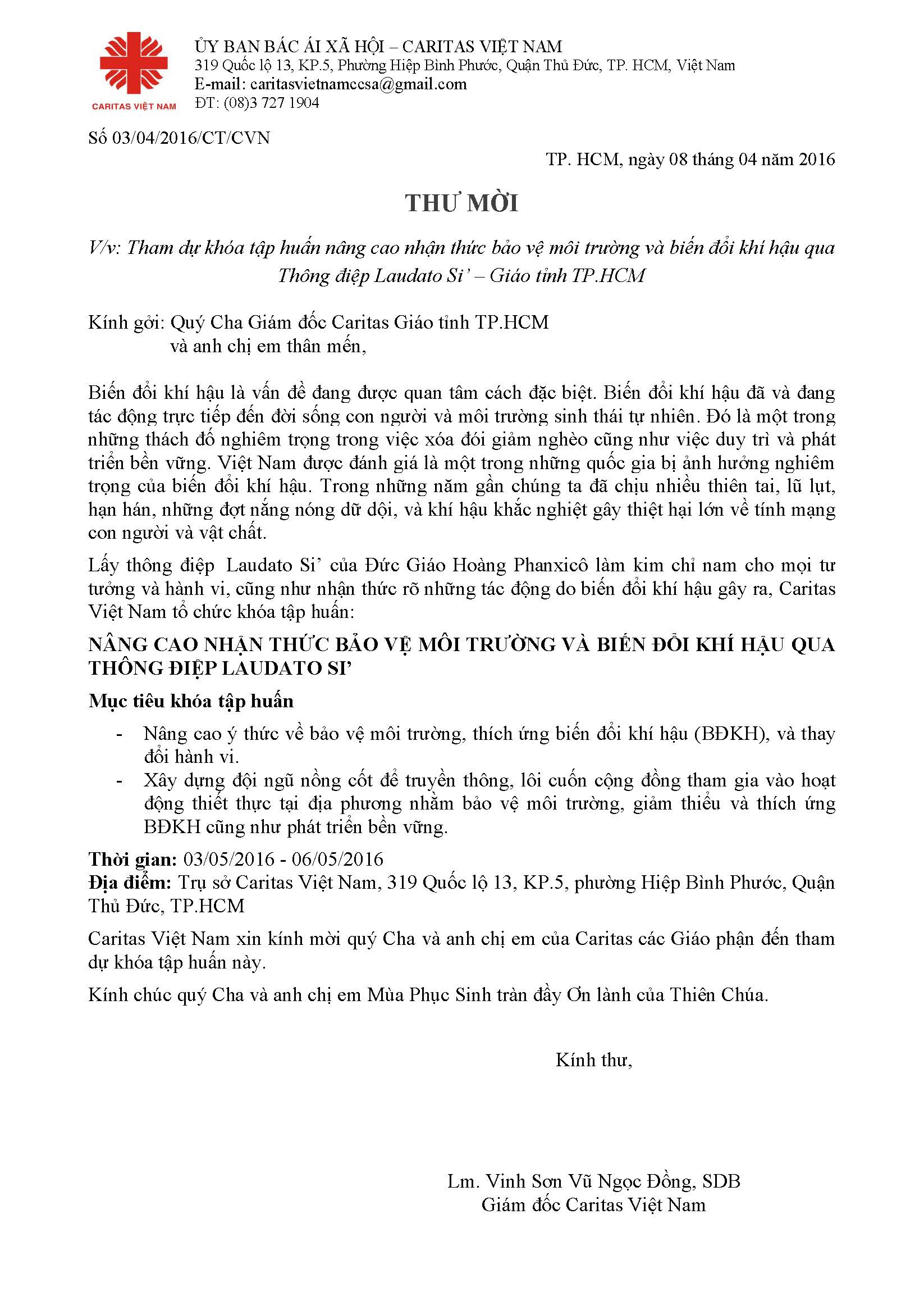 Thư mời khóa tập huấn nâng cao nhận thức bảo vệ môi trường và biến đổi khí hậu qua Thông điệp Laudato Sí - Giáo tỉnh TP.HCM