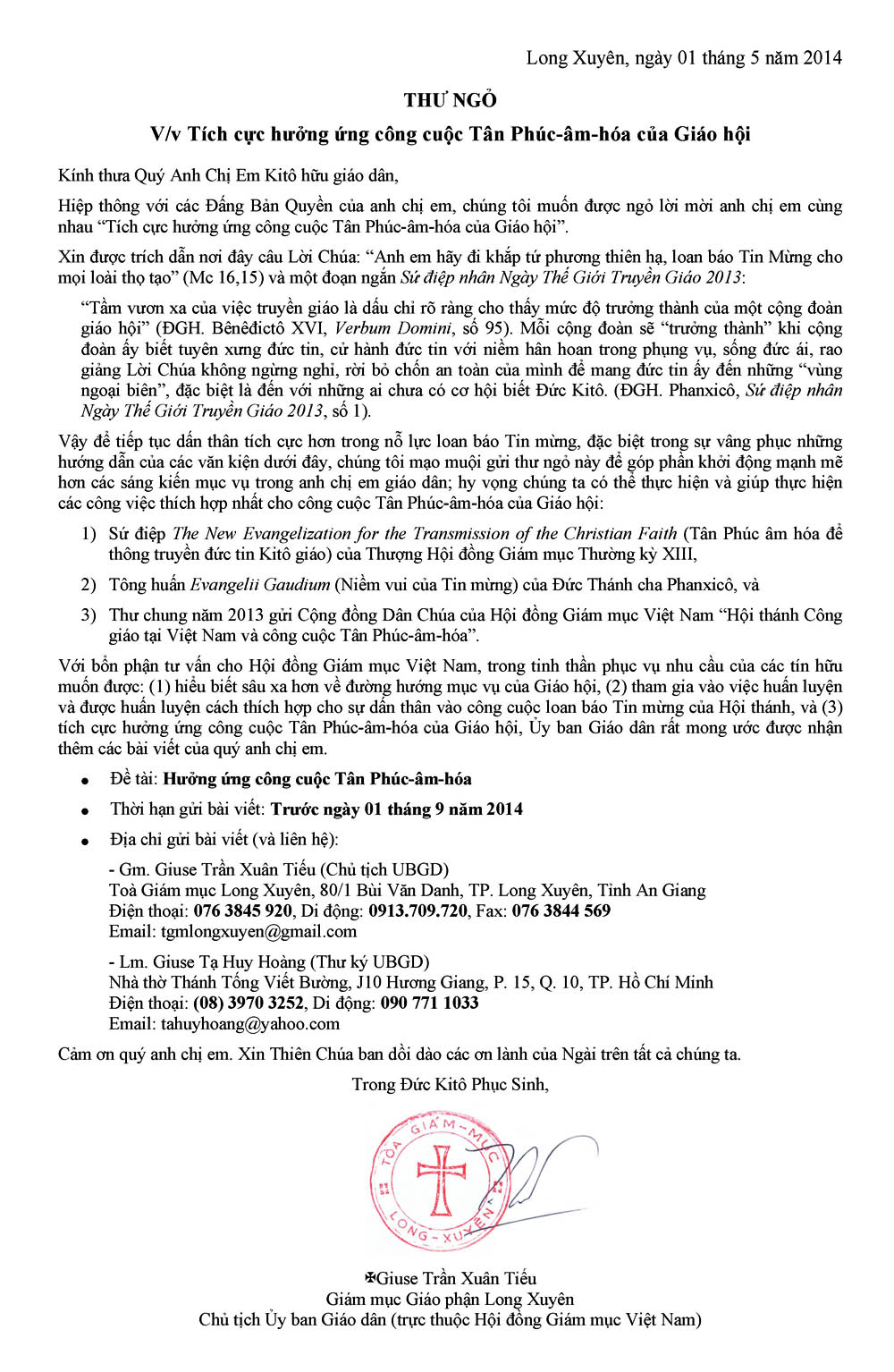 Thư ngỏ của Ủy ban Giáo dân/ HĐGMVN vận động hưởng ứng công cuộc Tân Phúc - âm - hóa