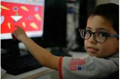 | Một cậu bé Syria tị nạn chỉ lá cờ Syria mà em vẽ khi tham gia một lớp vi tính vào ngày 19/6/2014 tại Trung tâm di cư Caritas tại Dahr El Ain, gần Tripoli. Ảnh: Matthieu Alexandre, Caritas Quốc tế |